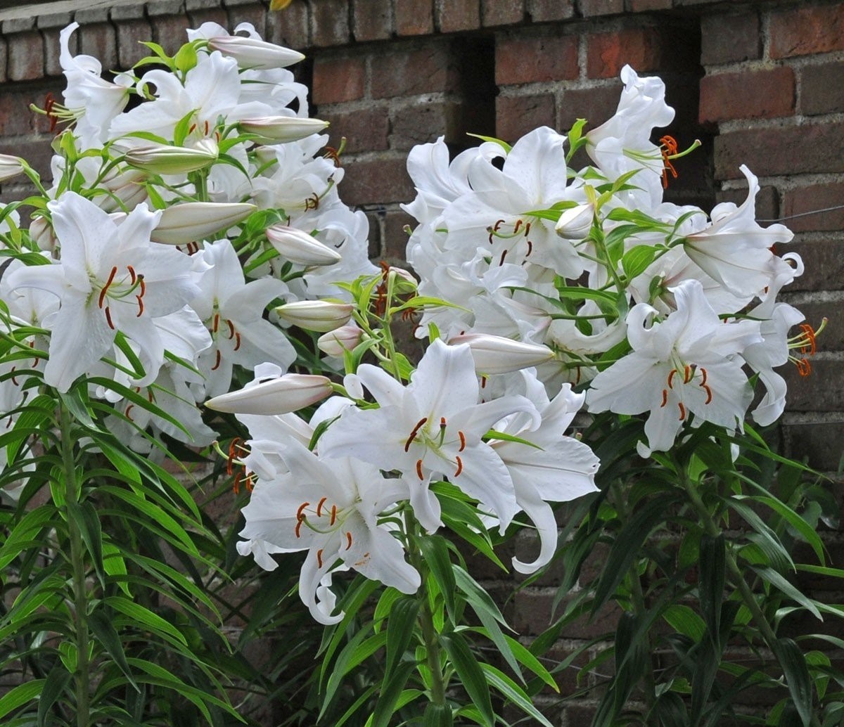 Kasablanka – это один из самых красивых белоснежных сортов, который одаривает цветоводов роскошными соцветиями исключительно однотонного белого цвета. Растение не маленькое, так как показатели в 120 см – это некая норма для этого восточного сорта. Диаметр бутонов также не маленький и составляет примерно 25 см. Ценность этого сорта еще в том, что на одном цветоносе формируется около девяти соцветий, которые одновременно распускаются.